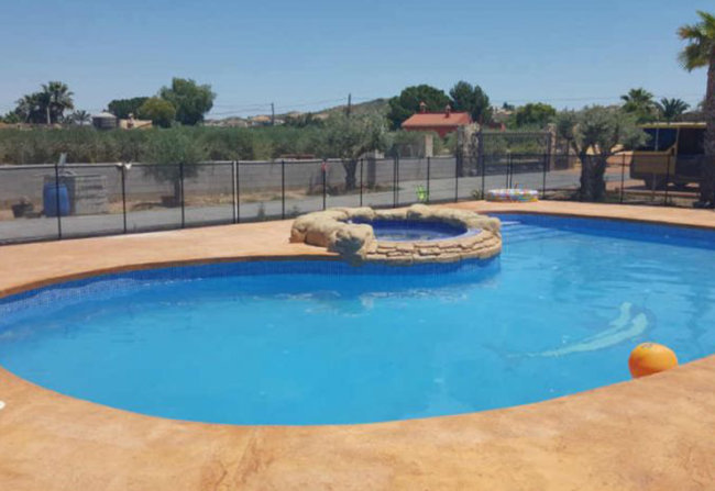 Piscina de hormigón con corona de pavimento impreso Cliente: Particular Categoría: Diseño y construcción Fecha: Junio 2019 Diseño y construcción en finca privada de piscina de hormigón con jacuzzi y pavimento impreso a su alrededor.