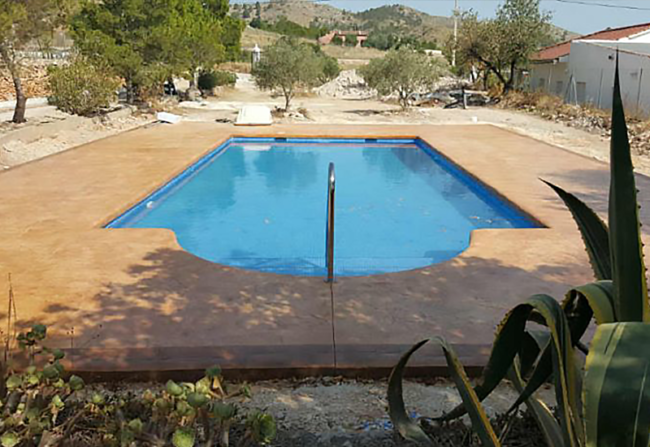 Piscina de hormigón con pavimento impreso Cliente: Particular Categoría: Diseño y construcción Fecha: Junio 2019 Diseño y construcción en finca privada de piscina de hormigón con jacuzzi y pavimento impreso a su alrededor.